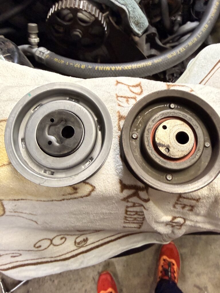 テンショナーを緩めてタイミングベルトを外し、新旧比較。